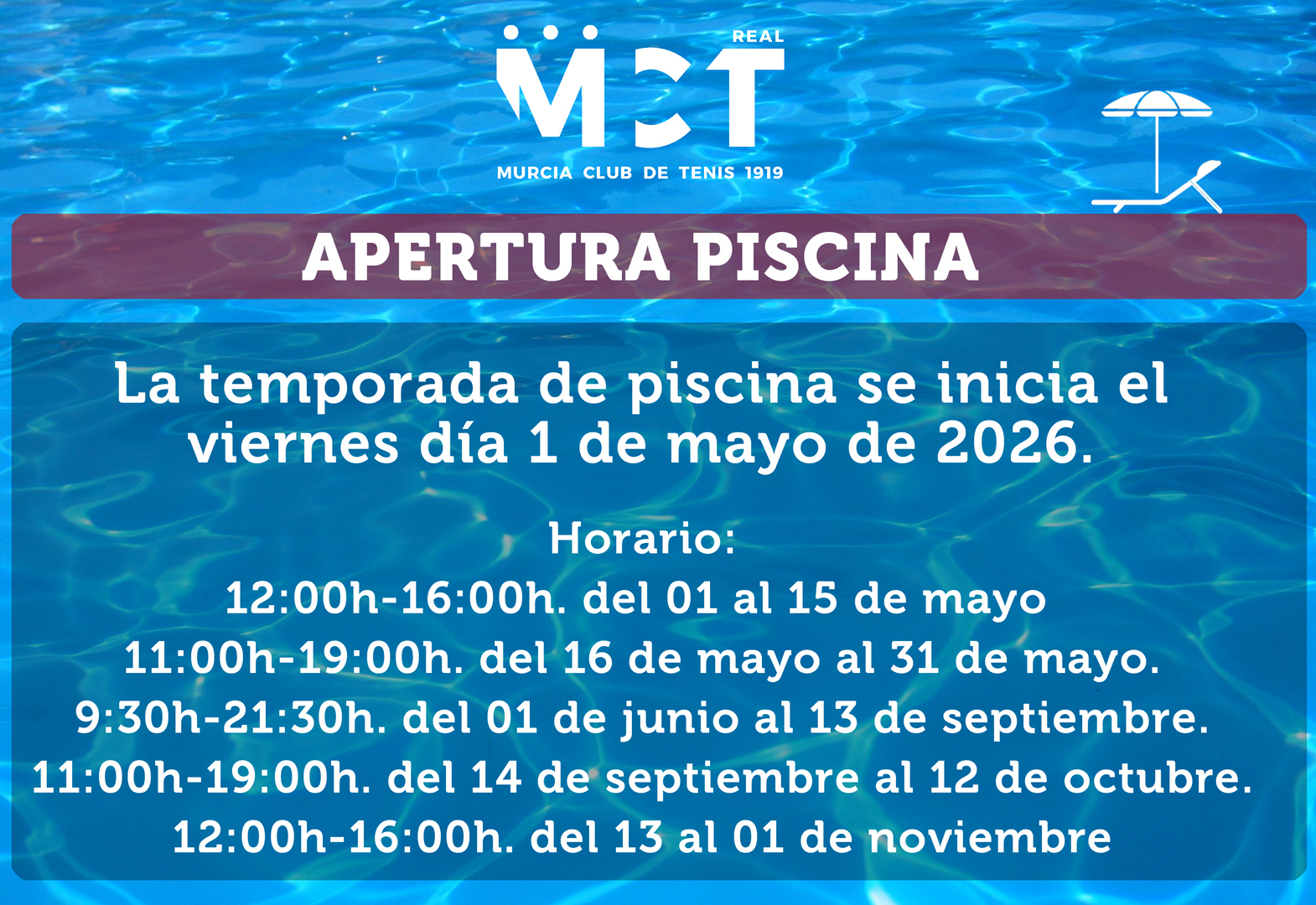 Apertura de la piscina – Verano 2026 Ver imagen más grande Por |2026-04-14T11:22:39+02:00abril 14th, 2026|Noticias|Sin comentarios Comparte en tus redes sociales FacebookXRedditLinkedInTumblrPinterest Artículos relacionados Concurso Paellas 2026 – RMCT1919 Concurso Paellas 2026 – RMCT1919 marzo 31st, 2026 | Sin comentarios I Concurso de Fotografía Challenger Costa Cálida Región de Murcia I Concurso de Fotografía Challenger Costa Cálida Región de Murcia marzo 30th, 2026 | Sin comentarios El Real Murcia Club de Tenis 1919 y Lexus Murcia renuevan su patrocinio El Real Murcia Club de Tenis 1919 y Lexus Murcia renuevan su patrocinio marzo 26th, 2026 | Sin comentarios Visita a la Biblioteca Regional de Murcia Visita a la Biblioteca Regional de Murcia marzo 25th, 2026 | Sin comentarios José Manuel Rodríguez Uribes, nombrado socio de honor del Real Murcia Club de Tenis 1919 José Manuel Rodríguez Uribes, nombrado socio de honor del Real Murcia Club de Tenis 1919 marzo 23rd, 2026 | Sin comentarios