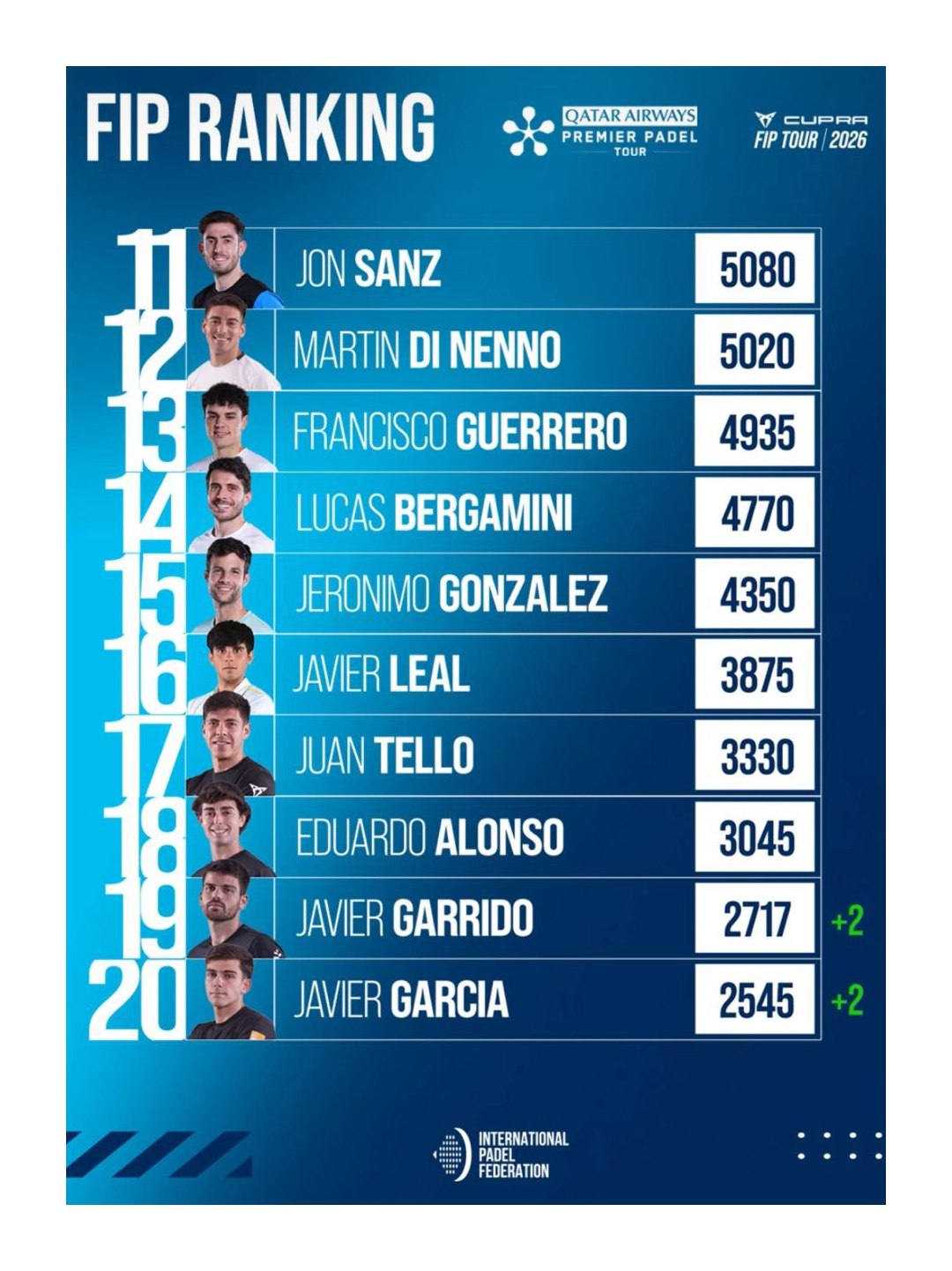 Nuestro Javi García entra por primera vez en el top 20 mundial. Esperemos sea un muy buen año para nuestro socio y jugador profesional de pádel.
